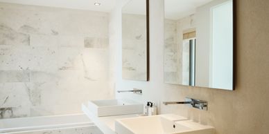 Countertops: Meticulously cleaned, disinfected, and organized. Vanities: Fronts thoroughly cleaned of all dirt, dust, and marks. Mirrors and glass doors: Thoroughly polished and cleaned. Sinks: Polished, sanitized, and cleaned. Bathtubs and showers: Shined, sanitized, and cleaned. Toilets: Thoroughly disinfected inside, outside, and surrounding areas. Trash: Garbage collected, disposed of properly, and cans wiped out. Floors: Thoroughly vacuumed and washed.